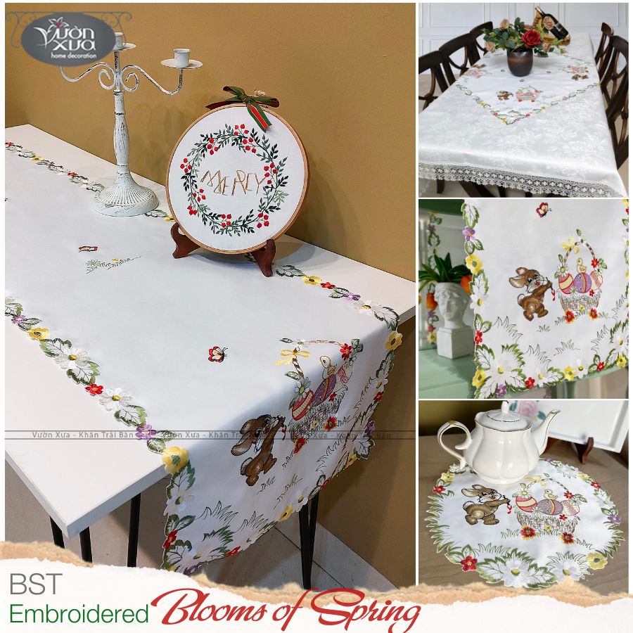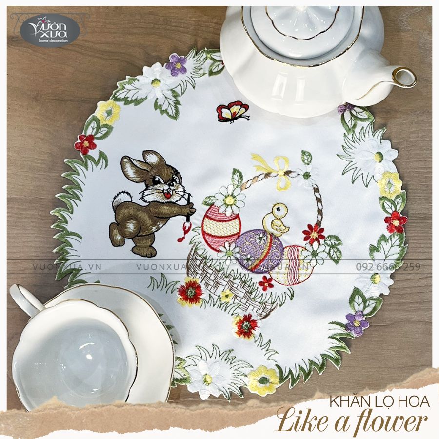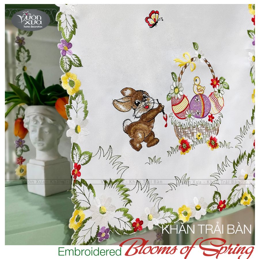 -Khăn thêu hình "Chú thỏ & Giỏ Hoa Mùa Xuân" (Đường kính 30 cm)