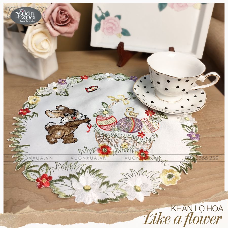 Combo 3 Khăn lót lọ hoa, tách trà, trang trí nhà (Khăn Hoa hồng ren chỉ màu be và 2 khăn thêu "Chú thỏ & Giỏ Hoa Mùa Xuân","Hoa cúc trắng"