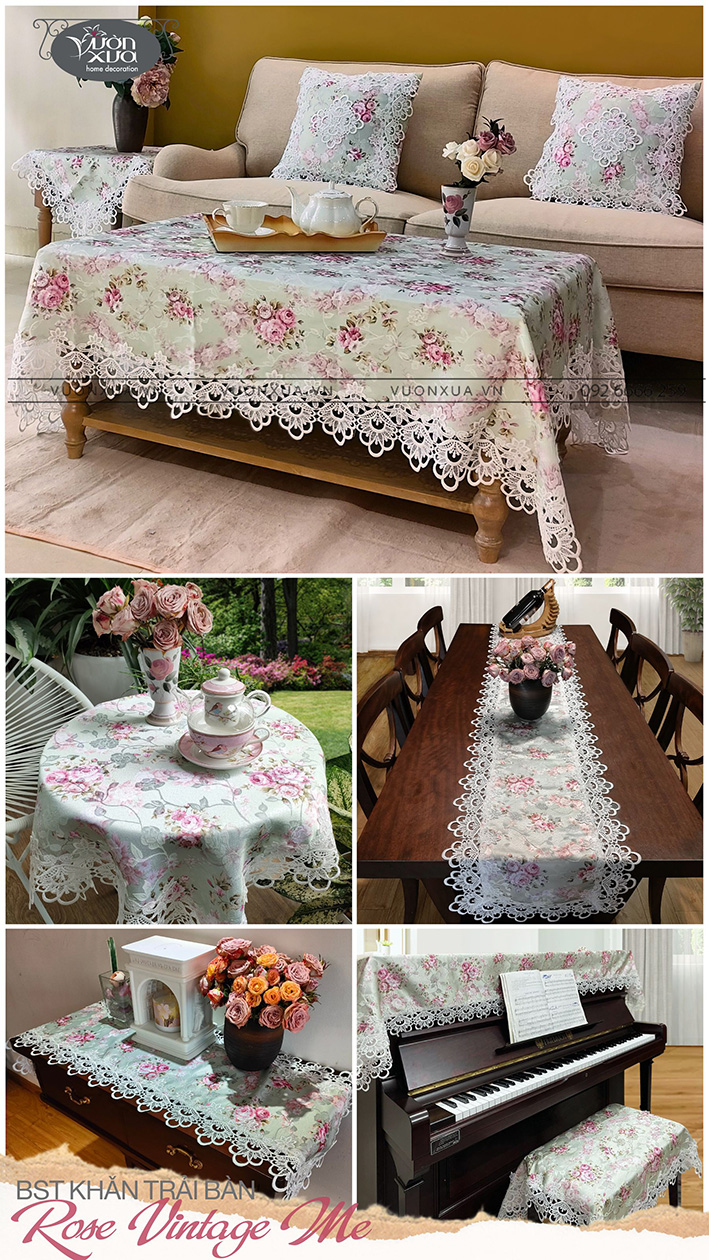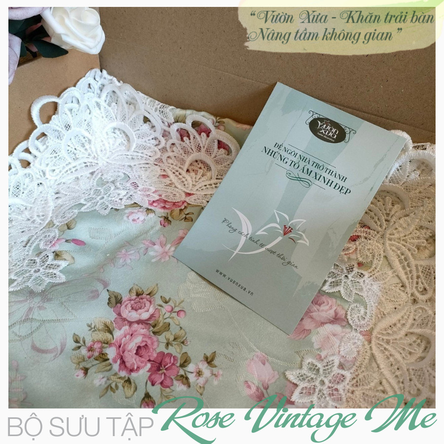 BST Khăn Trải bàn hoa Hồng "Rose Vintage Me", sẽ là "Làn gió mới " thú vị cho Nội thất nhà mình. Khăn vải vân óng như lụa hoạ tiết hoa Hồng Vintage, viền ren trắng đáp nổi tinh xảo. Đủ kích thước cho mọi loại bàn.