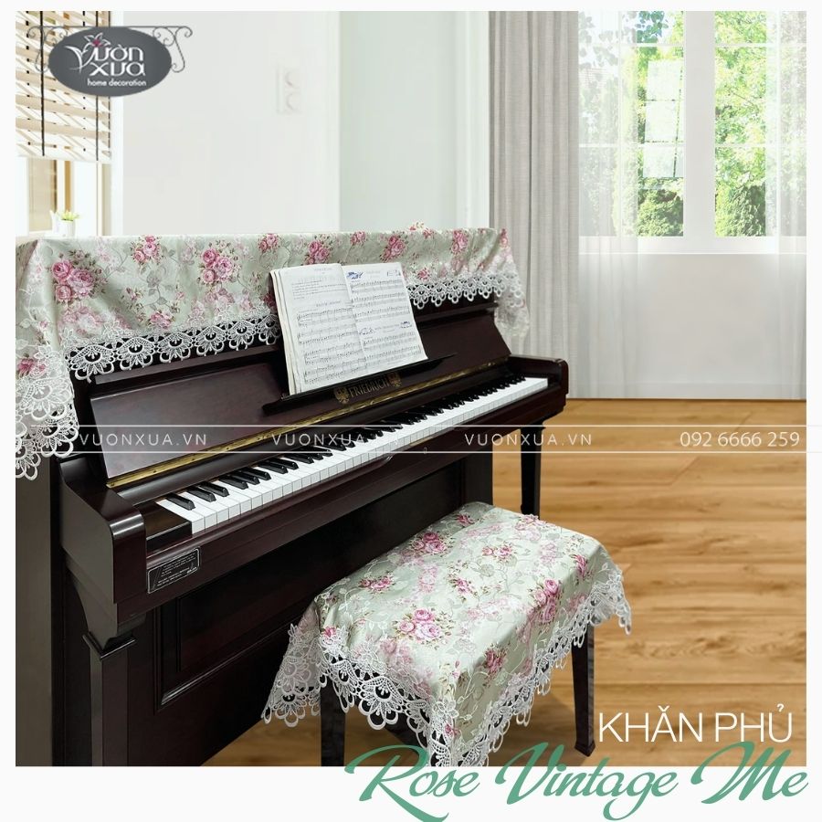 Khăn phủ đàn piano hoạ tiết hoa hồng, phong cách thanh lịch kiểu Pháp.