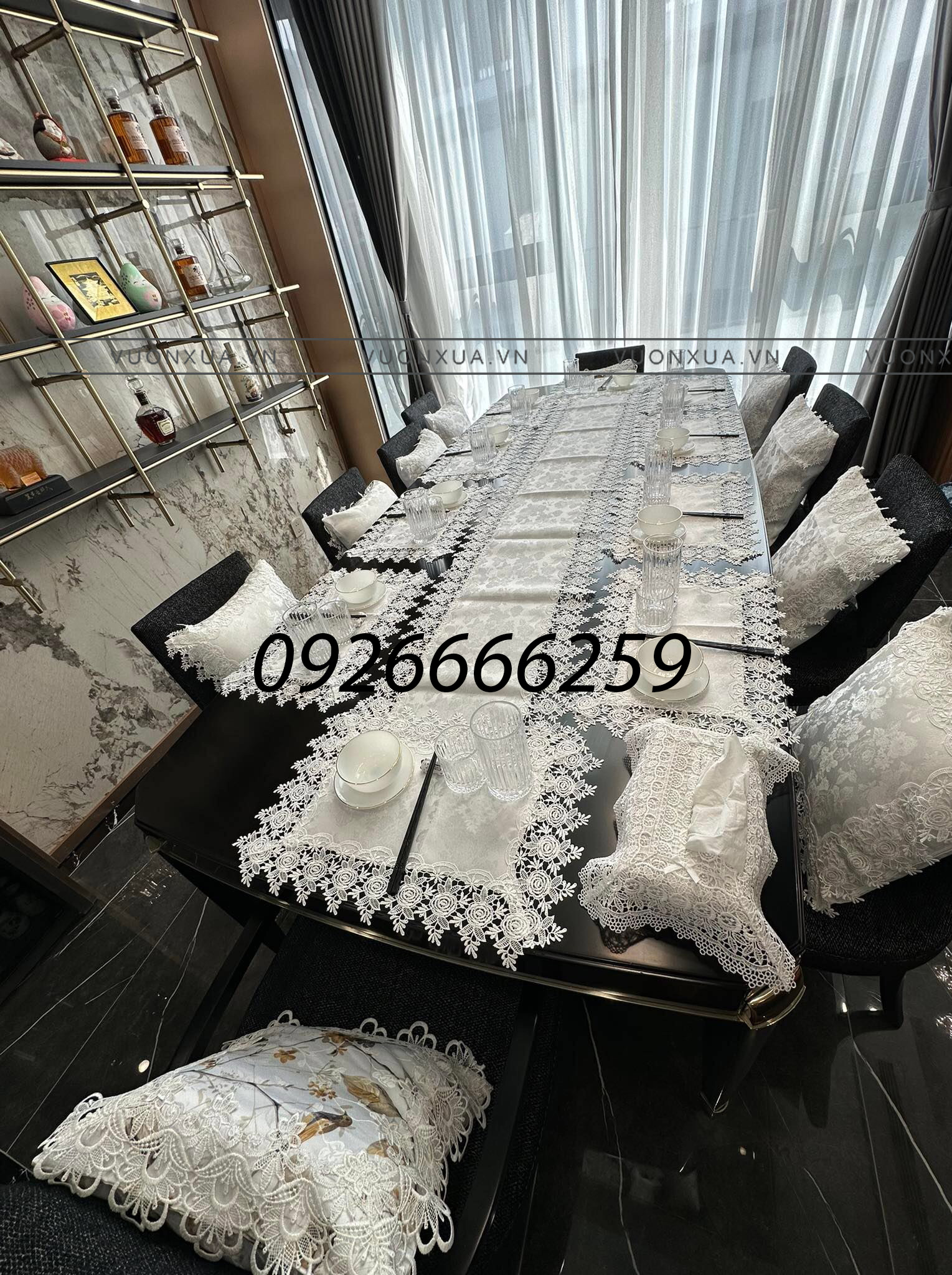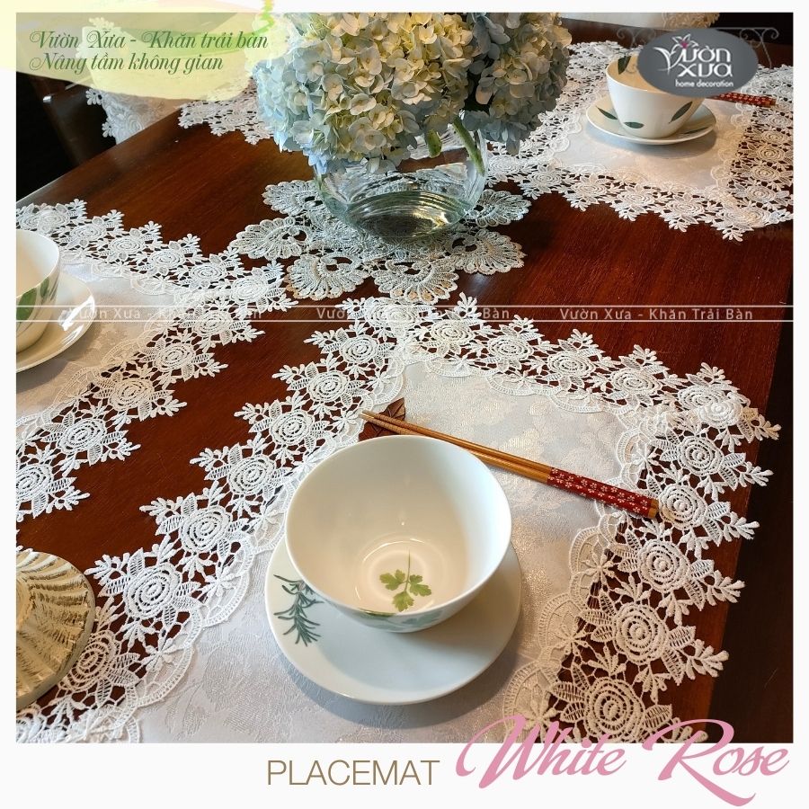 Tấm lót đĩa viền ren trắng vân gấm, set bàn ăn sang trọng nhà VƯỜN XƯA